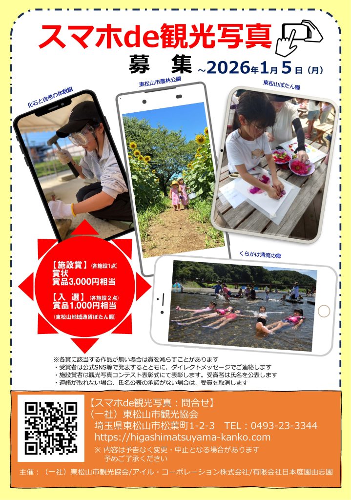 市内4施設「化⽯と⾃然の体験館・東松⼭市農林公園・東松⼭ぼたん園・くらかけ清流の郷」での楽しい写真を募集します。どなたでもメールで気軽に応募できますので、ぜひぜひご参加ください。