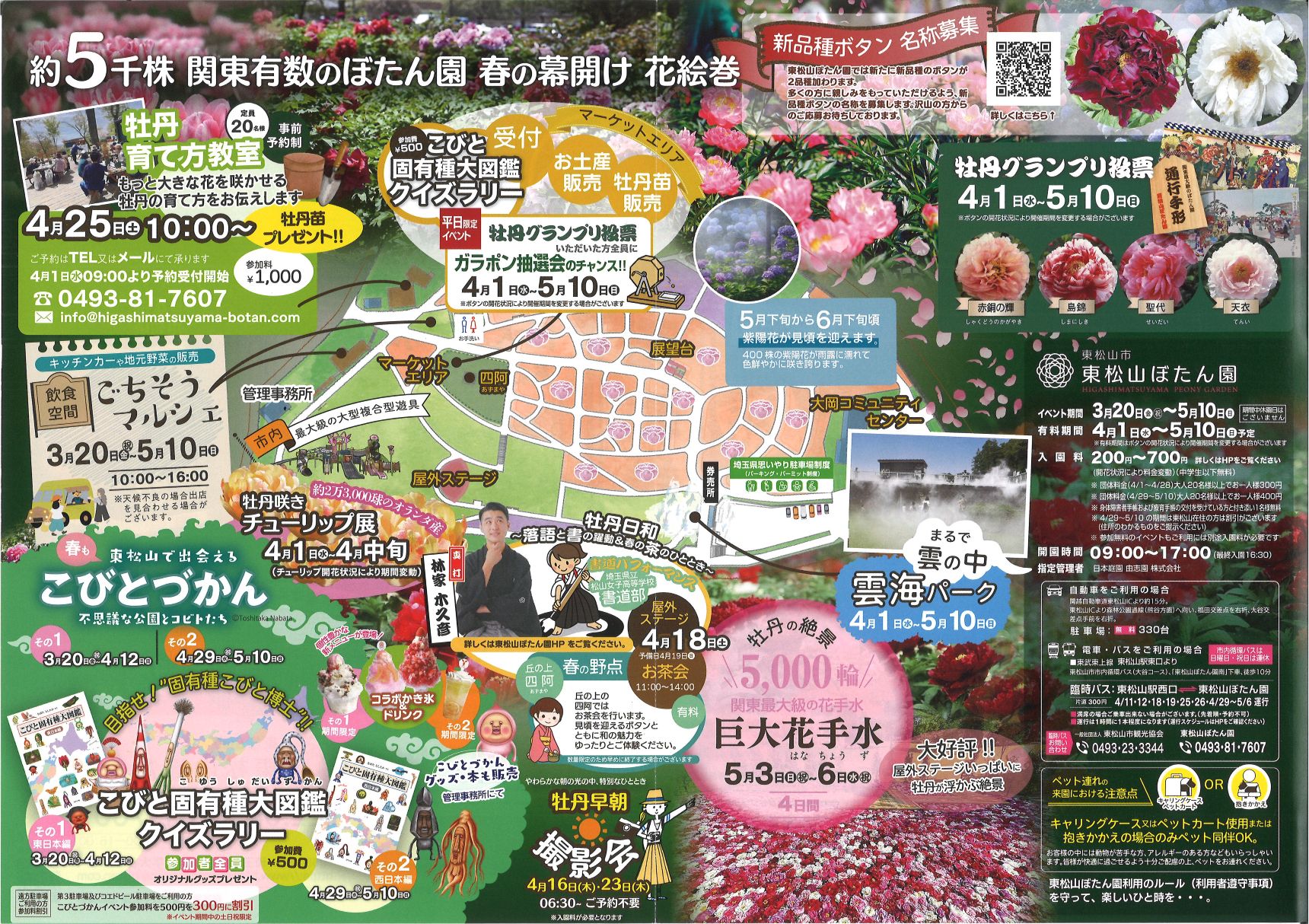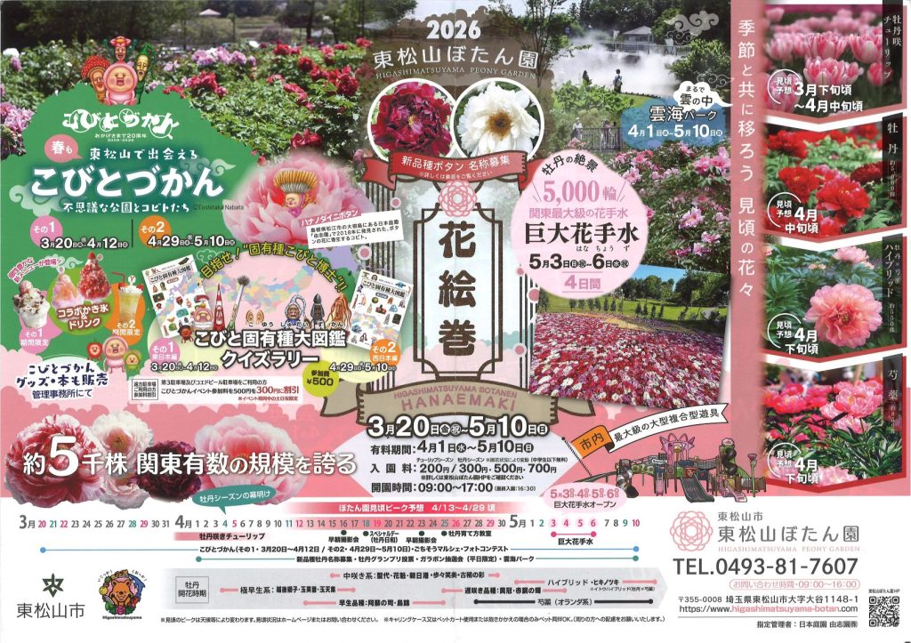 詳細、開花状況等の最新情報は東松山ぼたん園のページをご確認、または0493-81-7607までお問合せください。